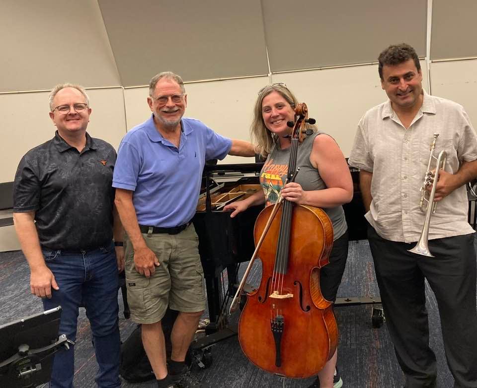 Anderson also performed at the International Trumpet Guild Convention in San Antonio on June 3rd in a concert featuring the Romantic Trumpet works of Stanley Friedman. This was the world premiere of Friedman’s Sonata in B minor for trumpet, cello, and piano, and also featured his first large scale work in the Romantic Style, Sonata no. 2 in F minor for Trumpet and piano. (Pictured below are Composer Stanley Friedman, Anderson, Carrie Pierce (Professor of Cello at Texas A&M University Corpus Christi) and Matthew Swihart (Professor of Trumpet at Nicholls State University).